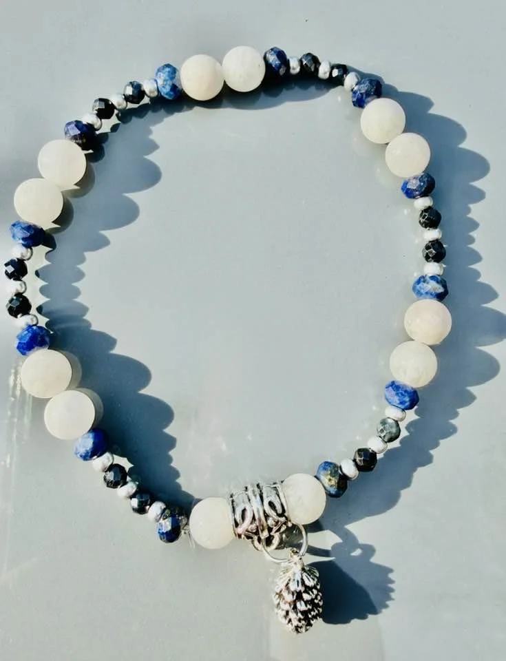 Accented with Czech glass silver beads and a pine cone charm. Fits 7.5-8” wrist. Message me if interested $30